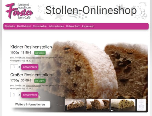 Saisonaler Online-Shop für das Weihnachtsgebäck Christstollen von einer kleinen Bäckerei. Dieser ist temporär im Jahr von Anfang Oktober bis Ende Dezember geöffnet. Es werden darüber ca. 100 Bestellungen je Saison aufgegeben. Die Basis bilden PHP 8 und MySQL. Eine eigene Administrationsoberfläche bietet umfangreiche Verwaltungsmöglichkeiten und eine komfortable Paketverfolgung.