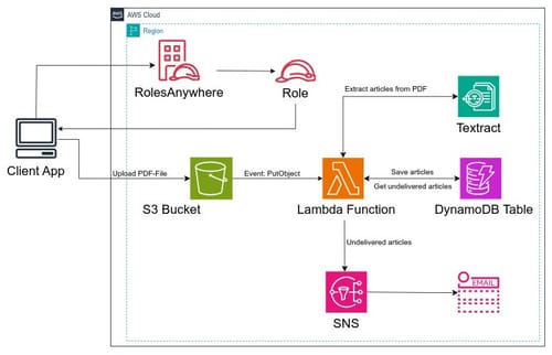 AWS Serverless-Projekt zur automatischen Verarbeitung von Lieferanten E-Mails. Es soll ein Abgleich von bestellten zu gelieferten Artikeln gemacht werden, bei nicht gelieferten Bestellartikeln erfolgt eine Benachrichtigung per E-Mail. Eine Client-Applikation filtert die nötigen E-Mails des Lieferanten heraus und lädt die angehängten PDF-Dokumente für Bestellung und Lieferung in ein S3-Bucket. Automatisch werden dann neue Dokumente im S3-Bucket mittels Lambda Function verarbeitet.