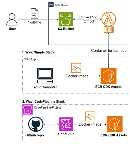 AWS Serverless-Projekt zur automatischen Konvertierung von OpenDocument-Dateien (*.odt) in ein PDF-Dokument (*.pdf) beim Upload in ein S3-Bucket. Die Lambda-Funktion nutzt einen Docker-Container, in dem LibreOffice installiert ist und der die Konvertierung ins PDF-Format übernimmt. Das Docker-Image wurde sehr generisch gehalten, so dass die PDF-Konverter-Anwendung sowohl auf X86 als auch auf ARM64 ausgeführt werden kann.